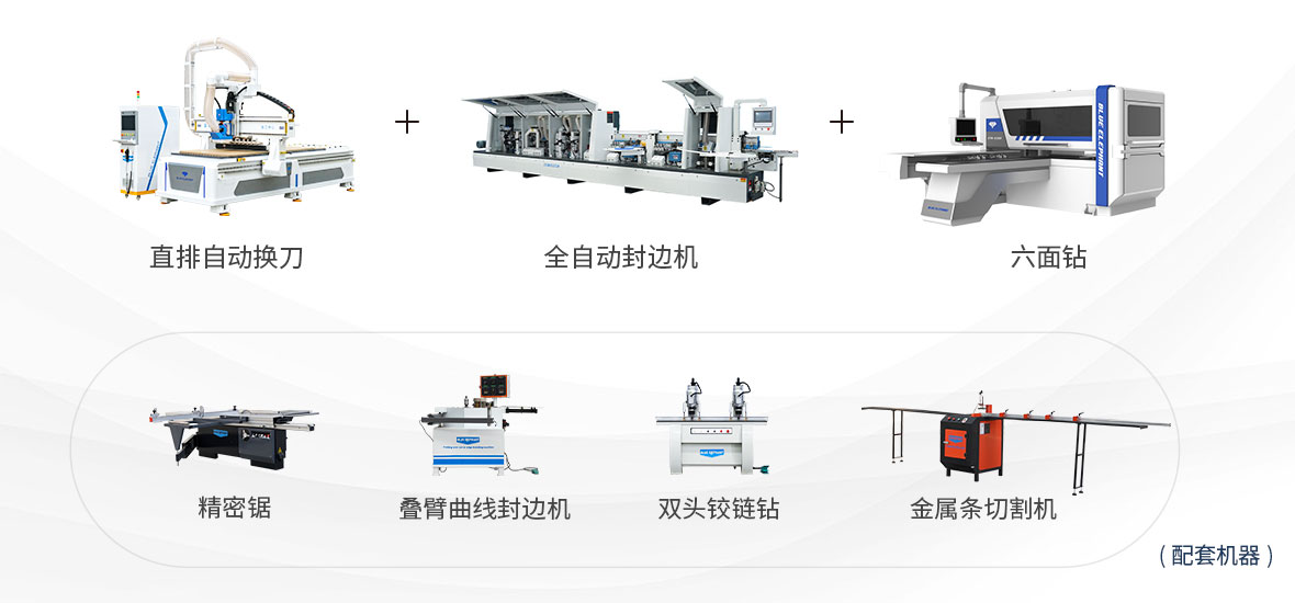 ?高端型-板式家具生產(chǎn)設(shè)備方案高端型板式家具生產(chǎn)設(shè)備方案主要由直排換刀加工中心、封邊機、六面鉆三個大設(shè)備及精密鋸、疊臂封邊機、雙主軸鉸鏈鉆、金屬條切割機等配套機器組成,可滿足全屋定制廠家的生產(chǎn)加工,機器