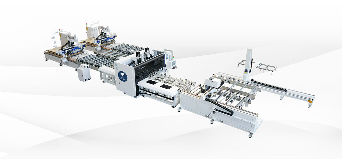 一拖二貼標鉆切單元是一套自動化程度比較高的數控開料解決方案。由三工位龍門上料、自動貼標機、雙鉆包六面鉆、兩臺全自動數控開料機以及動力滾筒線、中控系統組成。可實現自動上料、自動貼標、上下孔槽及切割加工。是一種自動化程度高,效率高、性價比高的板式家具自動化生產方案。